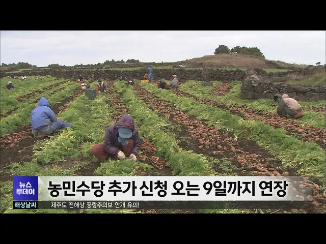 제주도가 오는 9일까지주소지 읍면사무소와 동 주민센터에서농민수당 추가 신청을 받습니다. 당초 농민수당 신청은지난달 4일부터 29일까지 이뤄졌지만미신청 누락자가 생기는 걸 막기 위해 연장하기로 했습니다. 농민수당 지급 대상은올해 1월 1일 기준으로3년 이상 제주에 주소를 두고 실제 거주하는 농업인으로 탐나는...