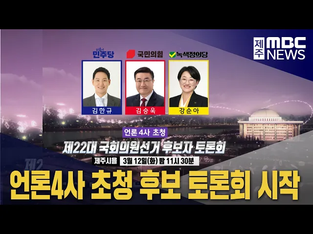 ◀ 앵 커 ▶ 22대 국회의원 선거를 앞두고제주지역에서 첫 후보자 토론회가 열렸습니다. 제주MBC와 제주일보, 제주CBS, 제주의소리 등 언론 4사가제주시을 선거구 후보자를 초청해 진행한토론회에서 제2공항을 비롯한 다양한 분야에서정책을 내놨습니다. 박주연 기자입니다.◀ 리포트 ▶ 첫 토론회에서 제주시을 선거구의쟁점은...