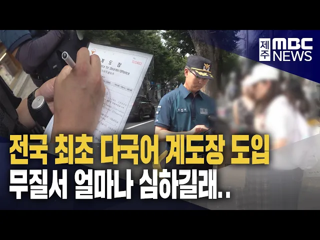 ◀ 앵 커 ▶ 제주를 찾는 외국인 관광객이 늘면서 무단횡단이나 쓰레기 투기 등 기초질서를 어기는 외국인들이 끊이지 않고 있는데요. 단속과 계도활동에도 줄어들 기미가 없자 경찰이 전국에서 처음으로 중국어와 영어가 들어간 계도장을 만들었습니다. 김항섭 기자입니다. ◀ 리포트 ▶ 횡단보도가 아닌 차도를 건너던 중 경...