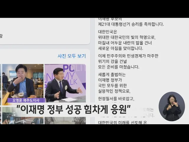 오영훈 제주도지사도 이재명 대통령 당선을 축하하며 응원의 메시지를 남겼습니다. 오 지사는 본인의 페이스북을 통해 이재명 후보의 대선 승리를 축하한다며 제주도민 모두의 마음을 모아 이재명 정부의 성공을 힘차게 응원한다고 밝혔습니다. 또 대한민국이 어두운 내란의 밤을 건너 새로운 아침을 맞이하게 됐다며, 새 ...