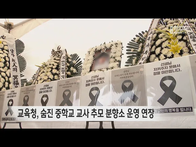 제주의 한 중학교에서 숨진 교사를 위한 추모 분향소 운영이 연장됩니다. 제주도교육청은 교육청 앞마당에 설치한 추모 분향소 운영을 당초 25일에서 오는 30일 오후 6시까지 연장하기로 했습니다. 숨진 교사는 오늘 발인식을 갖고 장례절차를 마치고 영면에 들었습니다. 경찰은 조만간 유족들과 만나 휴대전화와 메신저 ...
