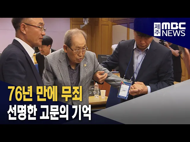 ◀ 앵 커 ▶ 제주 4.3 당시 누명을 쓰고 재판을 받았던 90대 할아버지가 76년 만에 무죄를 선고받았습니다. 4.3 희생자로 결정되지 않은 일반재판 수형인이 무죄 판결을 받은 건 이번이 처음입니다. 김항섭 기자입니다. ◀ 리포트 ▶ 한 손에 지팡이를 짚은 백발의 할아버지가 부축을 받으며 법정으로 향합니다. 제주 4.3 당...