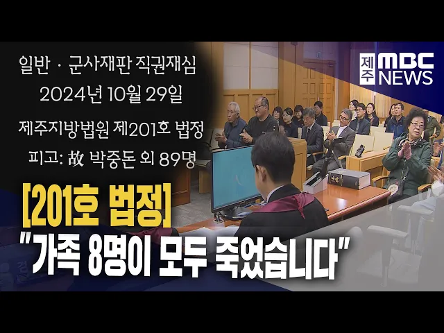 (블랙 자막) 일반·군사재판 직권재심 2024년 10월 29일 제주지방법원 제201호 법정 피고:고 박중돈 외 89명 ◀ SYNC ▶ 문성윤 /변호사 "이 사건 피고인들은 4.3 와중에 불법으로 연행돼 재심대상(이 되는) 판결을 선고받고 복역하다가 상당수의 피고인들은 행방불명돼 고향으로 돌아오지 못했습니다. 고향으로 돌아오지 못한...