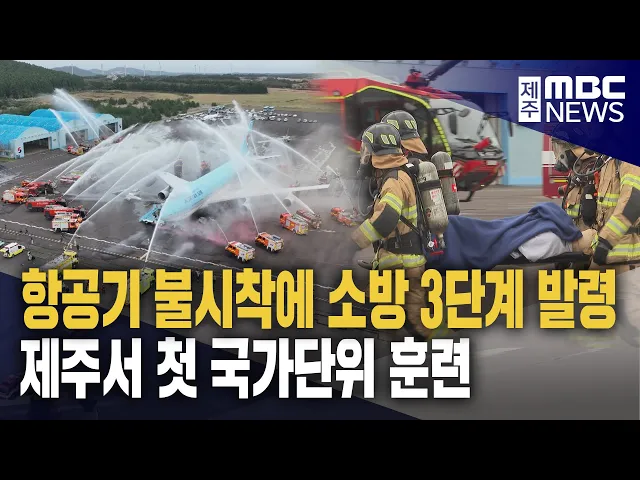 ◀ 앵 커 ▶ 항공기 사고는 한 번 발생하면 큰 인명피해로 이어질 수 있습니다. 항공기가 주요 교통수단인 제주는 이런 사고를 대비한 매뉴얼이 반드시 필요한데, 항공기 불시착 상황을 가정한 국가 단위 재난 대응 훈련이 제주에서 처음 실시됐습니다. 훈련 현장을 김항섭 기자가 다녀왔습니다. ◀ 리포트 ▶ ◀ SYNC ▶ "현 시...