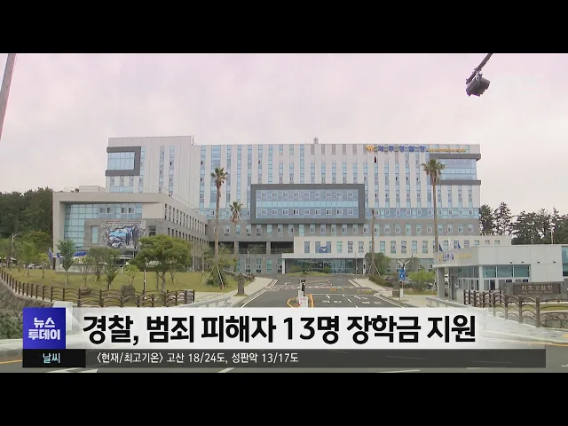 제주경찰청이 범죄피해자에게 장학금 5천200만 원을 지원합니다 장학금 지원대상자는범죄피해로 경제적 어려움을 겪고 있는 가정 폭력과 학교 폭력 피해자 등 13명입니다. 제주경찰청은 올해피해자보호 실무위원회를 통해범죄 피해자 63명에게1억 4천만 원을 지원했습니다.