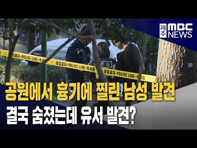 ◀ 앵 커 ▶ 제주시내의 한 공원에서 대낮에 90대 남성이 흉기에 찔린 채로 발견됐는데요. 이 남성은 심정지 상태로 병원에 옮겨졌지만 결국 숨졌습니다. 김항섭 기자입니다. ◀ 리포트 ▶ 평소 산책하는 시민들의 발길이 끊이지 않는 한 도심 공원. 공원 한쪽 나무들 사이로 노란색의 경찰 출입통제선이 설치됐습니다. 이곳...