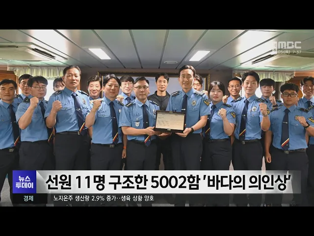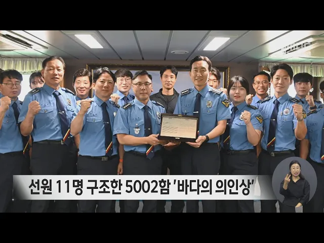 서귀포해양경찰서 오천이(5002)함이국제해사기구로부터'바다의 의인상'단체 장려상을 받았습니다.5002함은 지난 2월 15일 천900톤급 화물선 침수 신고를 받고 출동해 높이 5미터가 넘는 파도 속에서 선원 11명을 모두 구조했습니다. 국제해사기구는 5002함의 신속한 구조 대응과전문성을 인정해 '바다의 의인상' 장려상 수...