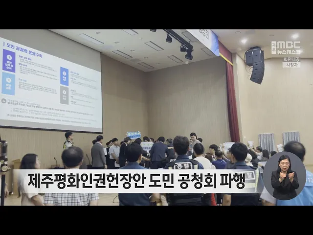 제주평화인권헌장안 도민 공청회가반대 단체의 난입으로 파행됐습니다. 제주도는 오늘(9) 제주혼디누림터에서 제주시 지역 제주평화인권헌장 도민 공청회를 개최했지만,반대 단체 관계자들이 공청회장을 점거하고단상에 난입하면서 10분 만에 종료됐습니다. 제주도는 민선 8기 도정 10대 핵심 공약인 도민참여형 제주평화인...