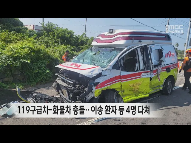 환자를 이송하던 119구급차가 화물차와 충돌해 환자와 구급대원들이 다쳤습니다. 오늘(24일) 오전 9시쯤 제주시 한림읍 금능사거리에서 환자를 이송하던 119구급차와 1톤 화물차가 출동해, 구급차에 타고 있던 이송 환자와 구급대원, 화물차 운전자 등 4명이 다쳐 병원으로 옮겨졌습니다. 경찰은 신호 위반으로 사고가 난 ...