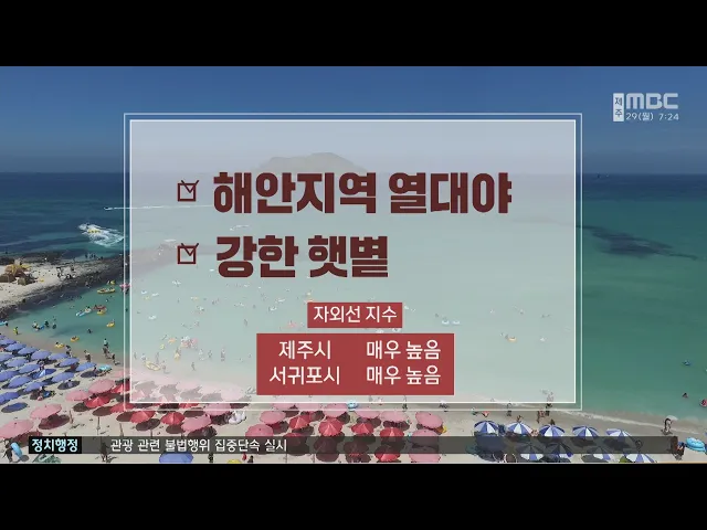 다음은 날씨 소식입니다. 연일 무더위가 이어지고 있습니다. 열대야로 인해 제주시는 밤사이 최저기온이 26.6도, 서귀포시는27.4도를 기록했는데요.제주시와 서귀포시는 햇볕도 강해서자외선 지수가 '매우 높음' 수준까지 오르겠습니다.제주도 산지와 남부중산간을 제외한전 지역에 폭염주의보가 내려졌습니다. 폭염주의보...