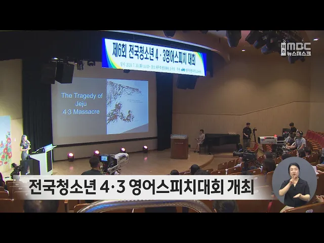 제6회 전국청소년 4.3 영어스피치대회가 제주학생문화원에서 열렸습니다. 이번 대회에는 전국에서 예선을 통과한20명의 학생들이 제주 4.3의 세대전승, 세계화, 평화·인권을 주제로 강연을펼쳤습니다. 학생들은 제주 4.3이 화해와 상생으로 나아가야 하는 교훈적 의미와 전 세계에 4.3을 알릴 수 있는 다양한 생각들을전했...
