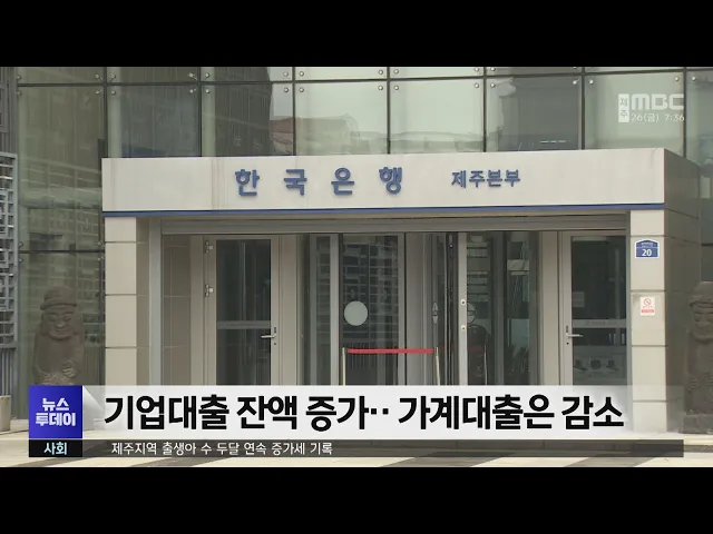 제주지역 기업대출은 증가했지만 가계대출은 감소한 것으로 나타났습니다. 한국은행 제주본부에 따르면 지난 5월 기준 제주지역 기업대출 잔액은 20조 3천900억여 원으로 지난해 같은 기간에 비해 4% 늘었고, 가계대출은 15조 6천억여 원으로 3.7% 감소했습니다. 기업대출 연체율을 0.93%로 전달보다 0.13% 포인트 늘었고, ...