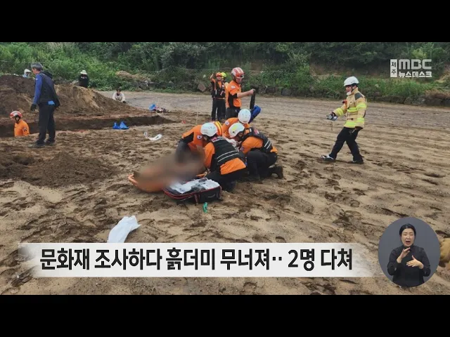 문화재 표본 조사 현장에서 흙더미가 무너져 작업자 2명이 다쳤습니다. 오늘(2일) 오후 1시 반쯤 제주시 구좌읍에서 문화재 표본 조사를 하던 60대 여성과 70대 남성이 쌓아둔 흙더미가 무너지며 깔렸습니다. 70대 남성은 스스로 탈출해 찰과상을 입었고, 60대 여성은 10여 분 만에 심정지 상태로 구조돼 병원에서 치료를 ...