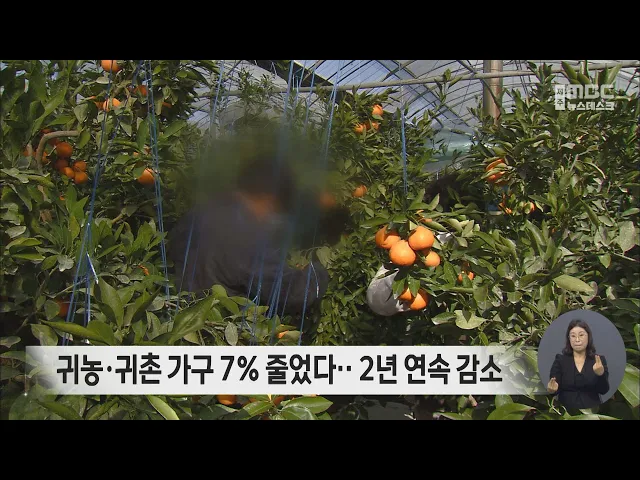 제주로 귀농, 귀촌하는 가구가2년 연속 감소했습니다. 통계청에 따르면 지난해 제주로 귀농, 귀촌한 가구는8천283가구로 지난해 8천903가구에 비해 7% 줄었습니다. 귀농 가구원도 352명으로 지난해보다 7.8% 줄었고,귀촌 가구원도 9.1% 감소했습니다. 귀촌 연령대는 40대가 24.4%로 가장 많았고 30대와 50대 순이었습니다.