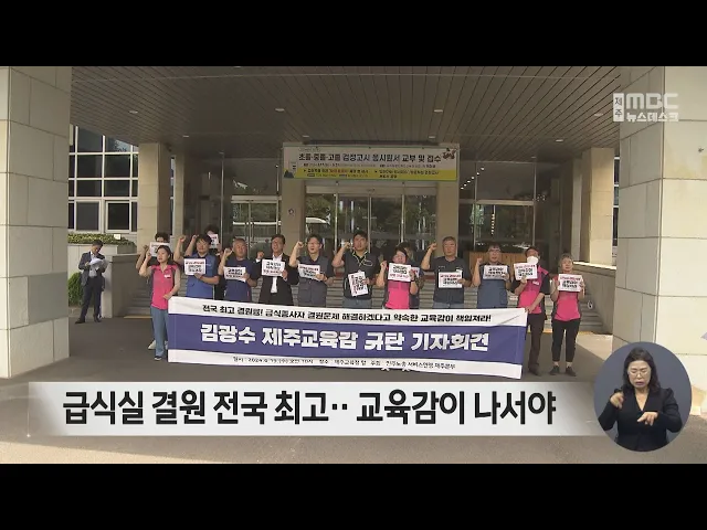 민주노총 서비스연맹 제주본부는 제주도교육청 앞에서 기자회견을 열고 제주도교육감이 학교 급식실 결원 사태에 대해 책임 있는 자세로 나서야 한다고 밝혔습니다. 이들은 올해 3월 제주 급식실 결원율이 약 60%로 전국 최고에 달했다며, 학교 급실식은 채용공고를 내도 찾아오는 사람이 없을 정도로 열악한 노동환경이 됐...