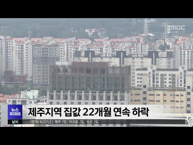 제주지역 집값이 하락세를 이어가고 있습니다. 한국부동산원이 발표한전국 주택 가격 동향을 보면지난달 제주지역 주택종합 매매가격은전달보다 0.15% 내리며22개월 연속 하락세를 유지했습니다. 유형별로는 아파트가 0.24% 떨어졌고연립주택은 0.14%, 단독주택은 0.06%하락했습니다. 지난달 주택종합 전세가격은 0.11%,월...