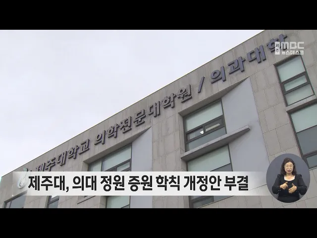 제주대학교가 의대 정원 증원을 위한 학칙 개정안을 부결했습니다. 제주대는 오늘(8일) 오후 평의회를 열고 의대 정원을 40명에서 70명으로 증원하는 내용의 학칙 개정안을 부결했습니다. 제주대학교는 총장이 일주일 안에 재심의를 요청할 수 있는데, 재심의에서도 부결되면증원이 어려울 수 있다고 설명했습니다. 한편, ...