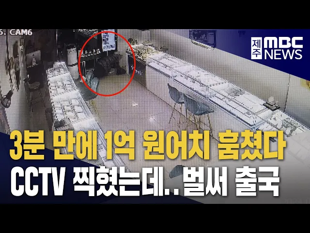 ◀ 앵 커 ▶ 제주의 한 금은방에서 1억 원어치의 귀금속이 하루아침에 사라졌는데요. 범행 장면이 CCTV에 고스란히 찍혀 미등록 중국인으로 확인됐는데, 범인은 범행 8시간 만에 중국으로 달아났습니다. 김항섭 기자입니다. ◀ 리포트 ▶ 새벽 시간 불이 꺼진 금은방. 모자를 쓴 한 남성이 뒷문으로 들어오더니 진열대를 향해 ...