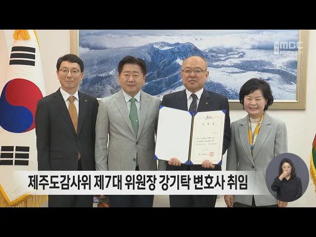 제주도감사위원회 제7대 위원장에 강기탁 위원장이 공식 취임했습니다. 신임 강기탁 위원장은 오늘(1일) 제주도청에서 오영훈 제주도지사에게 임용장을 받으면서, 앞으로 3년 동안 제7대 감사위원장 직을 수행하게 됐습니다. 강 위원장은 취임식에서 품질 높은 감사를 실행해 도민의 신뢰받는 자치감사 기구가 되겠다고 밝...