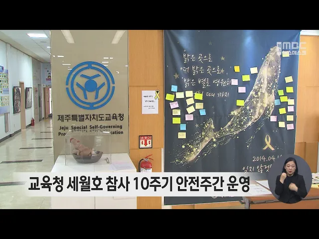 제주도교육청이 세월호 참사 10주기와 국민안전의 날을 맞아 오는 21일까지 안전주간을 운영합니다. 이번 안전주간 동안 도내 학교에서는 세월호 참사 10주기 추모 활동을 실시하게 됩니다. 또 학교에서 자주 발생하는 안전사고 예방을 위한 학생 교육과 점검이 이뤄지게 됩니다.