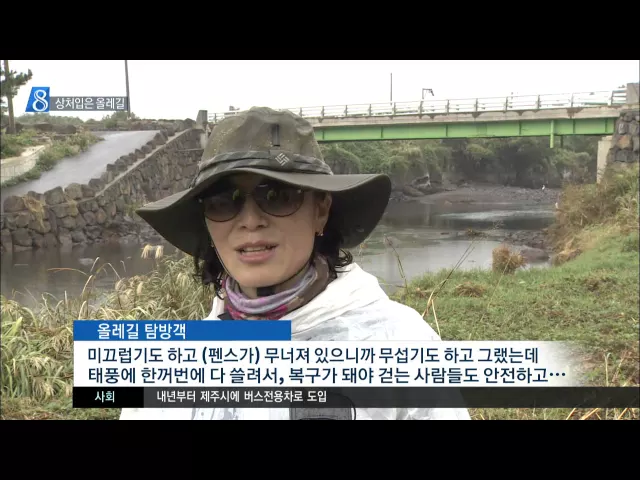 ◀ANC▶ 태풍 차바가 제주를 휩쓸고 지나가면서 올레길도 큰 피해를 입었는데요. 아직도 복구되지 않은 곳이 많아 탐방객들이 불편을 겪고 있습니다. 김항섭 기자입니다. ◀END▶ ◀VCR▶ 제주의 허파로 불리는 곶왈을 지나는 올레길 11코스. 커다란 나무 한 그루가 길을 완전히 가로막았습니다. 길가에는 강풍에 쓰러진...