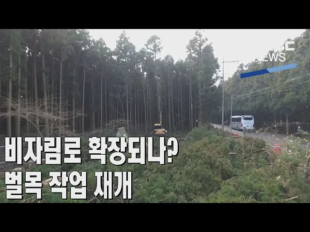 ◀ANC▶ 환경훼손 논란으로 여러차례 중단됐던 비자림로 확장 공사를 위한 벌목 작업이 2년 6개월 만에 재개됐습니다. 제주도는 비자림로를 생태도로로 만든다는 계획이지만 환경단체는 여전히 반발하고 있습니다. 김항섭 기자의 보도입니다. ◀END▶ ◀ANC▶ 요란한 전기톱 소리와 함께 10미터가 넘는 커다란 삼나무가...
