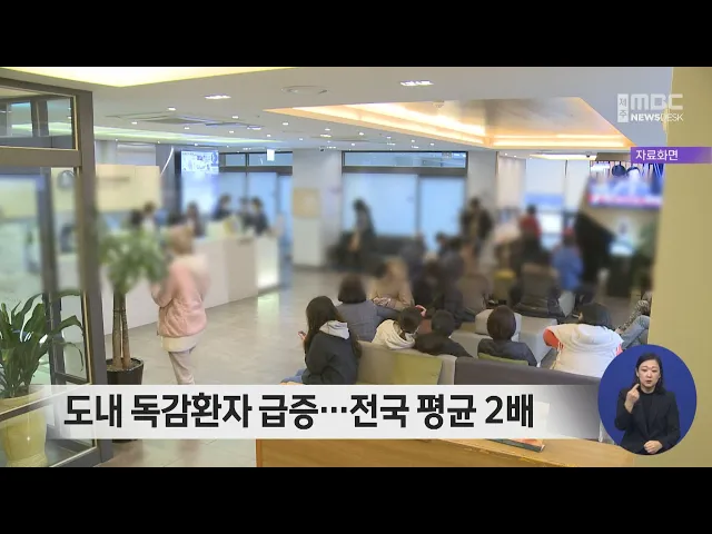 도내 독감환자가 크게 늘고 있습니다. 제주도에 따르면 지난주 독감 의심환자는 외래환자 천명 당 63.3명으로 전 주보다 3배 이상 늘었고, 전국 평균 30.3명보다 두 배 이상 많았습니다. 제주도는 코로나19와 독감이 동시에 유행할 조짐을 보이고 있다며, 마스크 착용 등 개인위생 준수를 당부했습니다.