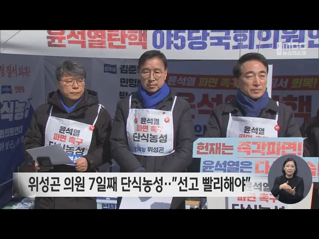 민주당 위성곤 국회의원이 탄핵심판 선고를 촉구하며 일주일째 단식 농성을 이어가고 있습니다. 위성곤 의원 등 국회의원 6명으로 구성된 야 5당 단식농성단은 기자회견을 열고 이번 심판이 역대 가장 긴 기간을 기록하고 있다며, 헌재는 국민적 관심이 집중된 사건에 대해 신속하고 공정한 결정을 내려야 할 의무가 있다고...