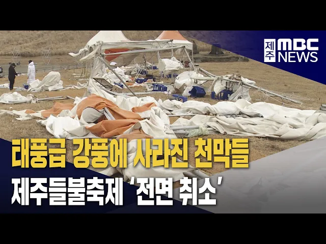 ◀ 앵 커 ▶ 오름 불놓기 논란으로 2년 만에 개최된 들불축제가 관심을 모았던 디지털 불놓기 행사를 앞두고 전면 취소됐습니다. 태풍급 강풍이 몰아치면서 행사장 천막 수십 동이 파손됐고 안전사고 우려가 커졌기 때문입니다. 김찬년 기자가 보도합니다. ◀ 리포트 ▶ 천막들이 형체를 알아볼 수 없을 정도로 쓰러졌습니다. ...