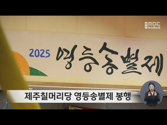 국가무형문화재이자 유네스코인류무형문화유산인 영등송별제가 오늘(13일), 칠머리당 실내 공연장에서 봉행됐습니다. 칠머리당 영등굿은 제주에 들어와 어업에 풍요를 주고 본국으로 돌아가는 영등신을 맞이하고 떠나보내는 전통 무속 제례의식으로 매년 음력 2월 1일은 영등환영제, 14일은 영등송별제를 지냅니다. 제주칠...