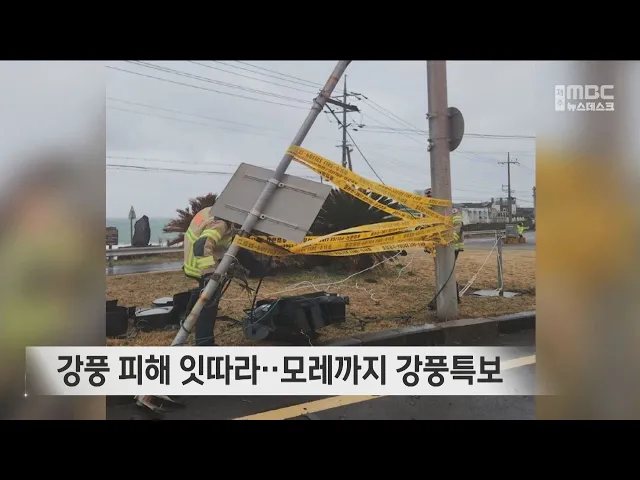 제주 전지역에 강풍특보가 내려지면서 추가 피해도 잇따랐습니다. 오늘 오전 8시쯤 제주시 한림읍에서는 신호등 전선이 끊어졌고, 7시 10분쯤 애월읍에서는 신호등이 파손되는 등 오늘 하루 5건의 강풍 피해가 접수됐습니다. 제주 전지역에 내려진 강풍주의보는 월요일인 모레 오후까지 이어지겠고 해안에는 5에서 20mm의 ...