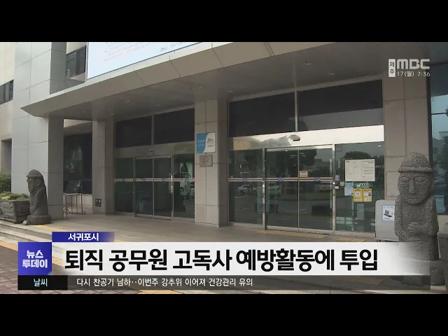 퇴직 공무원들이 고독사 예방활동에 투입됩니다. 서귀포시는 올해 인사혁신처가 주관하는 퇴직공무원 사회공헌사업에 선정돼, 위기가구를 발굴하고 복지서비스 업무를 지원할 퇴직공무원들을 복지매니저로 선발합니다. 선발된 복지매니저들은 공공임대주택이나 위기가구 밀집 숙박업소를 방문해 위기 가구를 발굴하고, 읍면...