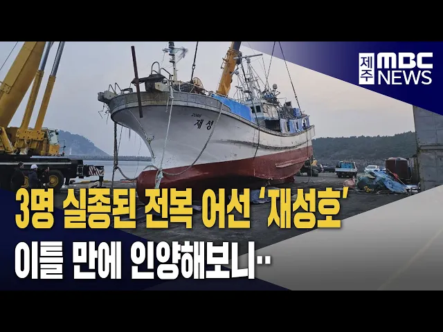 ◀ 앵 커 ▶ 지난 12일 서귀포 앞바다에서 전복된 재성호가 사고 나흘 만에 인양됐습니다. 배 안에 예상보다 많은 기름과 미끼 등이 있어 인양작업에 이틀이 걸렸는데요. 실종자를 찾기 위한 선내 수색작업은 시간이 좀 더 걸리 것으로 보입니다. 김찬년 기자가 보도합니다. ◀ 리포트 ▶ 크레인 줄에 걸려 물 위에 떠있는 32톤...