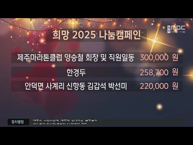 다음은 제주MBC에 희망 2025 나눔캠페인 성금을 보내주신 분들입니다. 제주마라톤클럽 양승철 회장과 직원일동이 30만 원, 한경두씨가 25만 8천700원, 안덕면 사계리에서 신항동, 김갑석, 박선미씨가 22만 원을 보내주셨습니다. 또, 양경완씨가 10만 원, 김정미씨가 6만 원, 박영희씨가 5만 원을 보내주셨습니다. 성금을 보...