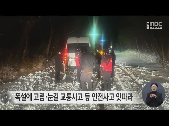 설 연휴에 몰아친 강풍과 폭설로 차량 고립과 교통사고 등이 잇따랐습니다. 제주도소방안전본부에 따르면 어제(29일) 저녁 8시 50분쯤 서귀포시 하원동의 한 도로에서 관광객 12명이 탄 승합차가 고립됐다 1시간 만에 구조됐습니다. 그제(28일) 오후 4시 10분쯤에는 제주시 용강동에서 승용차가 눈길에 미끄러진 뒤 고립되...