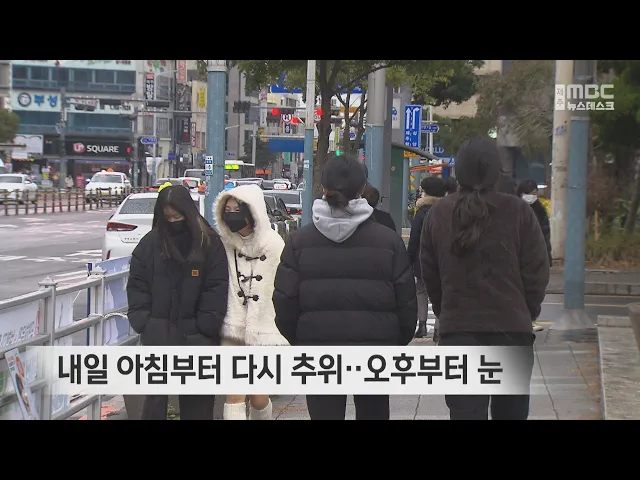 내일 아침부터 기온이 크게 떨어져 다시 추워지겠고, 비나 눈이 내리겠습니다. 내일 아침 최저기온은 4도에서 5도로 오늘보다 3도 가량 떨어지겠고, 낮에도 기온이 오르지 않으면서 5도에서 8도에 머물겠습니다. 오후부터 산지에는 시간당 1에서 3cm의 많은 눈이 내리겠고, 해안에는 비나 눈이 오겠습니다. 기상청은 찬공기...