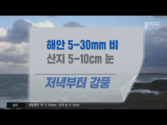 제주는 오늘 대체로 흐린 가운데 해안에는 곳에 따라 비가, 산지와 중산간에는 곳에 따라 비나 눈이 내리고 있습니다. 내일까지 해안에는 5에서 30mm의 비가 내리겠고, 산지에는 5에서 10cm의 눈이 쌓이겠으며, 오늘 저녁부터는 남부를 제외한 전 지역에 강한 바람이 불겠습니다. 북부지역은 흐린 가운데 비가 오겠고, 나머...