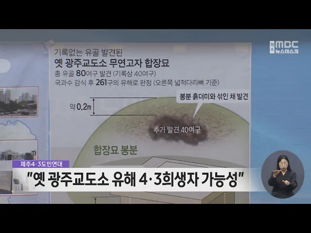 옛 광주교도소에서 나온 200여 구의 유해가 제주 4.3희생자일 가능성이 높다는 주장이 제기됐습니다. 제주4.3도민연대는 4.3당시 제주도민 179명이 광주형무소에 수감됐는데, 형무소에서 숨진 희생자들이 합장묘에 묻혔고 형무소가 광주교도로소 옮기면서 유해를 옮긴 것으로 보인다고 밝혔습니다.광주교도소 유해발굴은5.1...