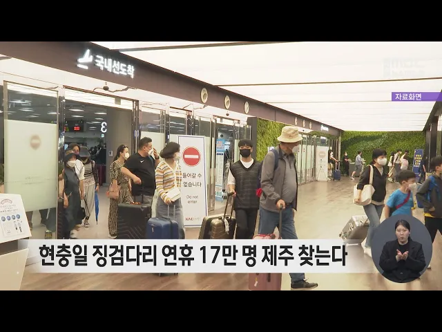 오는 현충일 징검다리 연휴 동안17만 명에 가까운 관광객이 제주를 찾을 것으로 보입니다. 제주도관광협회는오는 6일부터 9일까지 나흘동안항공편과 선박을 이용해 제주를 찾는 관광객이16만 9천을 넘을 것으로 전망했습니다. 지난해 같은 기간보다 3.9% 늘어난 수치인데, 국내선 항공편은 2.2% 줄었고, 국제선은 두 배 이...