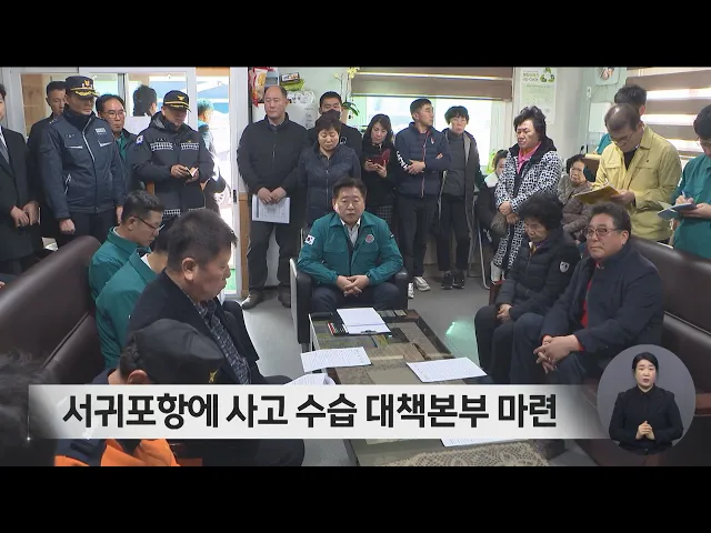 어선 전복 사고와 관련해 서귀포항에 사고수습대책본부가 마련됐습니다. 제주도는 사고 직후 서귀포항 어선주협회 사무실에 사고수습대책본부를 꾸리고실종자 수색과 구조자 병원 이송 등 사고 대응과 수습 등을 총괄하고 있습니다. 오영훈 제주도지사도 대책본부를 찾아 실종자 가족을 위로하고, 민관군과의 협업체계를 바...