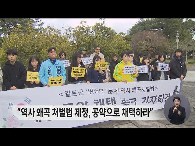 3.1절을 맞아 역사 왜곡에 대한 처벌법을 제정하라는 목소리도 나왔습니다. 제주청소년평화나비 등 제주지역 청년단체들은오늘 제주시 방일리공원 평화의 소녀상 앞에서 기자회견을 열고,국회의원 선거 출마 후보자들에게 역사 왜곡 처벌을 위한 법률 제정을공약으로 채택하라고 요구했습니다. 이들은 역사를 부정하는 자를...