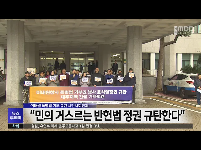 윤석열 대통령의 이태원 특별법 거부권 행사에 대해 제주에서도 비판의 목소리가 나왔습니다.제주지역 시민사회단체들은제주도의회 앞에서 기자회견을 열고 진상규명과 민의를 거부한 반헌법 정권은존재할 이유가 없다고 비판했습니다. 또, 유가족과 시민들이영하의 추위를 건뎌내며 요구한 간절한 염원을 비웃기라도 하듯 ...