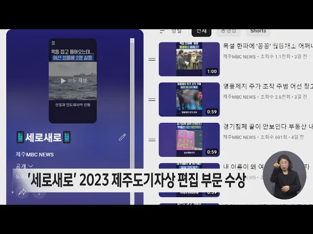제주MBC 유튜브 콘텐츠인 '세로새로'가 2023 제주도기자상 편집 부문 상을 수상했습니다. 세로새로는 방송 뉴스를 1분 미만의 세로 영상으로 만든 콘텐츠로지난해 8월부터 240여 개가 제작돼유튜브 제주MBC 채널에 게시됐습니다. 심사위원들은 모바일에 최적화된 형식으로 차별화를 해 레거시 미디어 플랫폼을 넘어선 발상...