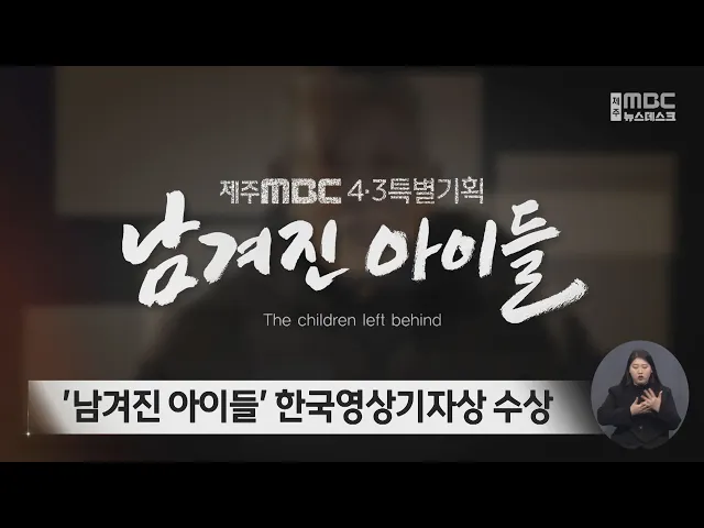 제주MBC가 지난해제작한 4.3특별다큐 '남겨진 아이들'이한국 영상기자상을 수상했습니다. 한국영상기자협회는 제주MBC 김현명 기자가 촬영하고김찬년 기자가 연출한 '남겨진 아이들'을 제37회 한국영상기자상 보도특집다큐부문 수상작으로 선정했습니다.'남겨진 아이들'은 4.3당시 부모를 잃고 홀로 남겨진 수형인 유족들의...