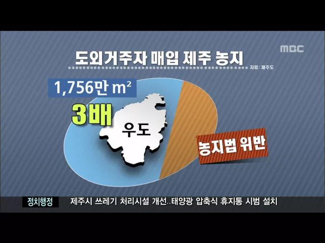 ◀ANC▶ 부동산 열풍에 최근 3년 동안 다른 지방 사람들이 사들인 제주도내 농지가 우도 면적의 3배에 이르는데요. 이 가운데 3분의 1이 관련법을 어기고 농사를 짓지 않거나 무단 전용한 것으로 드러났습니다. 김찬년 기자입니다. ◀END▶ ◀VCR▶ 서울에 사는 권 모 씨가 재작년 10월 농사를 짓겠다며 7억 원을 주고 ...