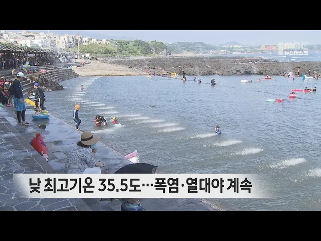 주말인 오늘도 제주 전 지역에 폭염경보가 내려진 가운데 낮 기온이 35도를 넘었습니다. 오늘 낮 최고기온은 중문이 35.5도를 비롯해 안덕이 34.5, 제주시가 33.3, 서귀포시가 33.8도를 기록했습니다. 휴일인 내일은 곳에 따라 5에서 40밀리미터의 소나기가 내리겠지만 33도를 웃도는 폭염과 열대야는 계속될 것으로 예보...
