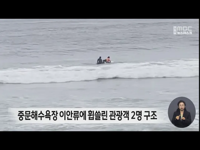 오늘 오후 1시 20분쯤 서귀포시 중문해수욕장에서 물놀이를 하던 20대 남녀 관광객 2명이 이안류에 휩쓸려 표류하다 출동한 해경대원에 구조됐습니다. 중문해수욕장에서는 지난 2일에도 물놀이객 2명이 표류하다 구조됐는데, 해경은 해안에서 반대 방향으로 빠르게 흐르는 이안류에 휩쓸리면 대각선 방향으로 헤엄쳐 빠져...