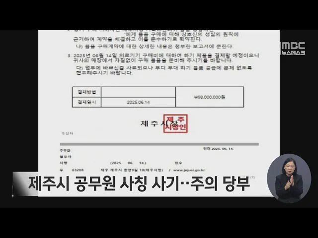 최근 각종 기관이나 공직자 등을 사칭한 위조 사기가 잇따르는 가운데, 제주시청 공무원을 사칭한 사기 사건도 발생하고 있습니다. 제주시는 지난 14일, 도내 모 소상공인에게 의료기기 구매 건이라는 위조된 시청 공문서를 보내 심장제세동기 납품을 요청하고, 가짜 명함을 문자로 발송하며 송금을 유도한 사기 사건이 발...