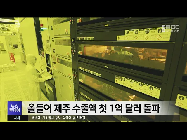 올들어 제주지역 수출액이 사상 처음으로 1억 달러를 넘어섰습니다. 제주도에 따르면 올들어 지난달까지 제주지역 누계 수출액은 1억 574만 달러로 5월 기준으로 사상 처음 1억 달러를 돌파했습니다. 제주지역 수출액은 최근 다섯 달 연속 성장세를 이어가고 있으며, 반도체와 항공기 부품, 과일주스 등이 증가한 반면 넙치...