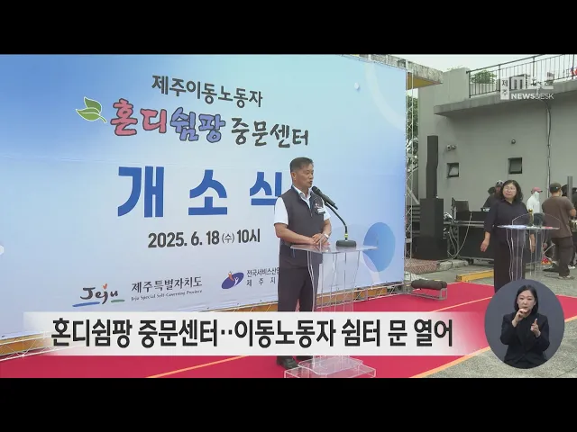 이동노동자들의 휴식을 위한 쉼터인 혼디쉼팡 중문센터가 문을 열었습니다. 개소식은 전국서비스산업노조가 주관해 관계자 50여 명이 참석했고, 이번 중문센터 개소는 제주시청과 서귀포, 연동센터에 이어 제주에서는 네 번째입니다. 혼디쉼팡 중문센터는 115㎡에 텔레비전과 컴퓨터, 발마사지기 등 편의시설을 갖추고 24시...